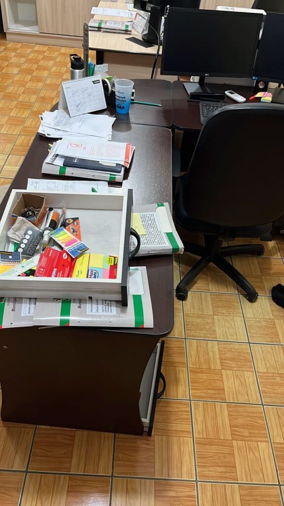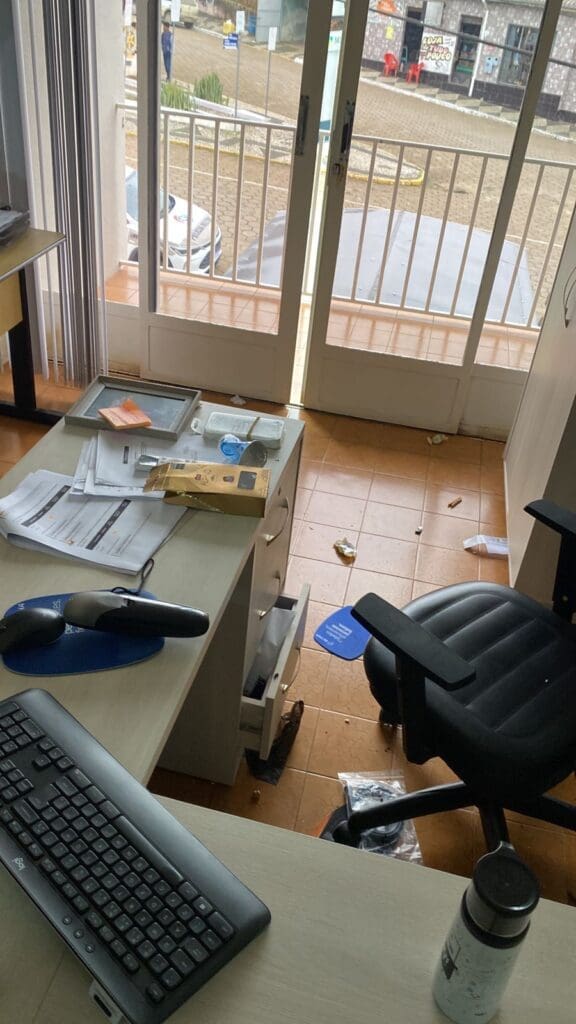 Foram arrombadas três portas internas e levados 2 edredons, um par de sapatos de trabalho, 5 caixas de chocolate, 15 pacotes de biscoito, 1 carregador de celular, uma bolsa de data show. Além disso foram consumidos alimentos e refrigerantes no local, deixando um rastro de bagunça e sujeira.